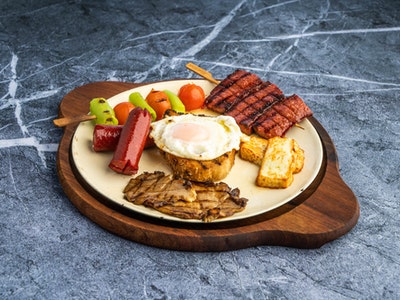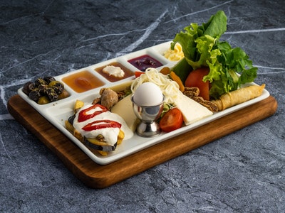 Söğüş tabağı (domates-salatalık-yeşillik), peynir tabağı (beyaz peynir-tulum peyniri-kaşar peyniri -çeçil peynir), sigara böreği, sahanda sucuklu yumurta, reçel çeşitleri, kahvaltılık çemen, bal, kaymak, tereyağ, çikolata, yeşil zeytin, siyah zeytin, potta çay (TEK KİŞİ SERVİSİMİZ YOKTUR.MASADAKİ KİŞİ SAYISINA GÖRE SERVİS EDİLMEKTEDİR.)